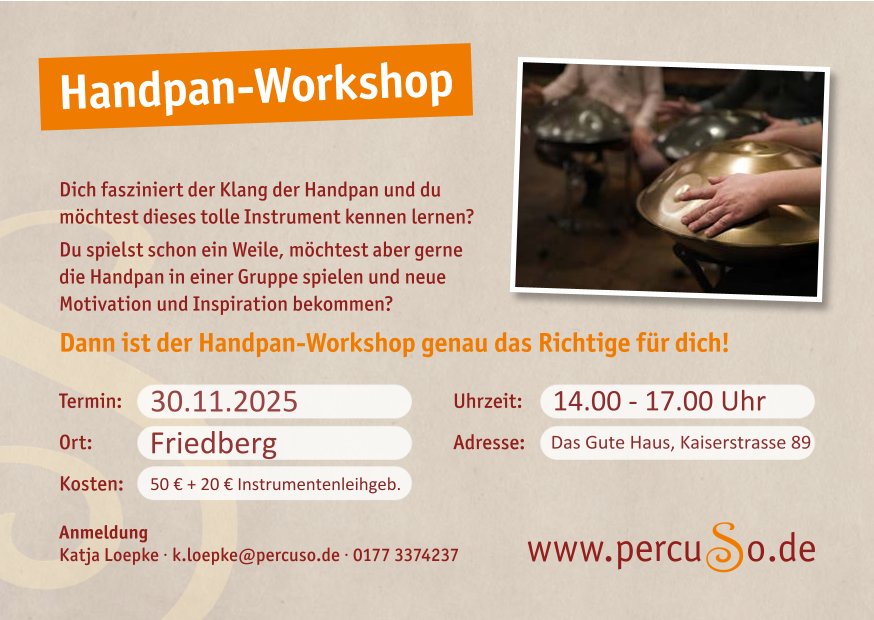 14-17h: Handpan-Workshop Letzte Aktualisierung am 26.11.2025 Datum 30 Nov. 2025 Uhrzeit 14:00 - 17:00 Veranstaltungsort dasgute.haus - Friedberg Kaiserstraße 89, 61169 Friedberg Telefon 06031 1616385 Kategorie ErwachseneJugendKreativesSenioren Veranstalter Percuso - Raum für Rhythmus Website http://www.percuso.de Nächste Veranstaltung Weihnachtsmarkt Datum Nov. 30 2025 Uhrzeit Ganztägig