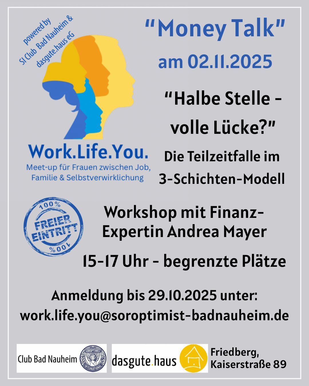 Im Rahmen der Veranstaltungsreihe Work.Life.You. lädt der Soroptimist International Club Bad Nauheim gemeinsam mit dasgute.haus eG am Sonntag, den 2. November 2025, um 15 Uhr in dasgute.haus nach Friedberg (Kaiserstraße 89) ein.